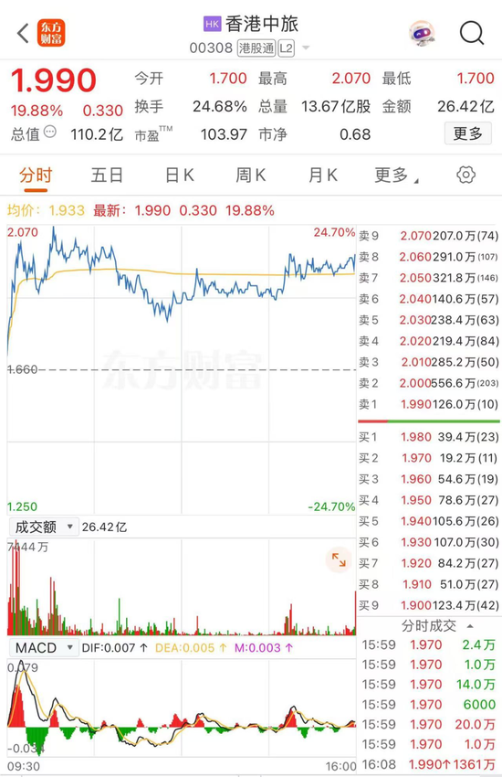 受益于暑期文旅旺季带动,今日早盘,港股旅游板块短线热度攀升。多只酒店旅游概念个股涨势活跃。其中,香港中旅盘中涨超24%。截至收盘,股价涨19.88%,报1.99港元/股,成交额逾26亿港元。近10个交易日,香港中旅累计涨幅超过90%。