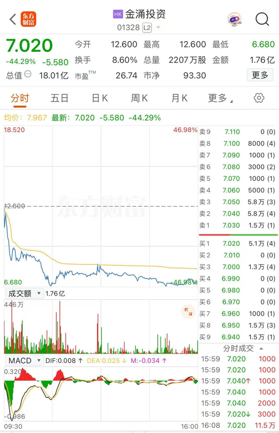 7月9日,港股金涌投资开盘后迅速走低,盘中一度跌近47%。截至收盘,金涌投资股价跌超44%,报7.02港元/股,总市值18.01亿港元,成交额为1.76亿港元。昨日收盘,金涌投资股价涨幅达到533%。